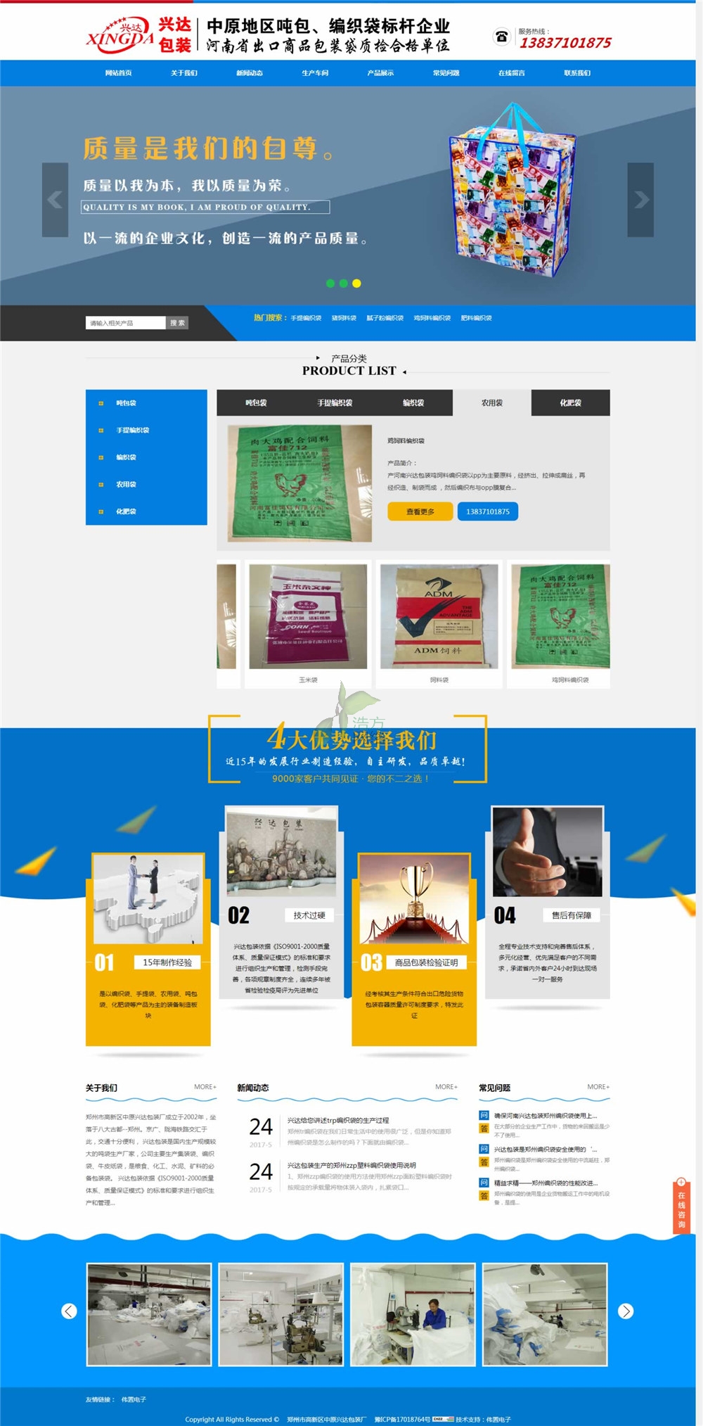 客戶簡介:鄭州市高新區(qū)中原興達包裝廠成立于2002年,坐落于八大古都--鄭州。京廣、隴海鐵路交匯于此,交通十分便利,是國內(nèi)生產(chǎn)規(guī)模較大的噸袋生產(chǎn)廠家,公司主要生產(chǎn)集裝袋、編織袋、牛皮紙袋,是糧食、化工、水泥、礦料的必備包裝袋。興達包裝依據(jù)《ISO9001-2000質(zhì)量體系、質(zhì)量保證模式》的標準和要求進行組織生產(chǎn)和管理,檢測手段完善、各項規(guī)章制度齊全,興達包裝連續(xù)多年被省檢驗檢疫局評為產(chǎn)品合格的先進單位,興達包裝現(xiàn)有固定資產(chǎn)5010余萬、占地4680平方米、員工245人、生產(chǎn)能力強大,可向興達客戶提供出口商品的包裝檢驗證明。望各界人士與興達包裝通力合作、共創(chuàng)輝煌。