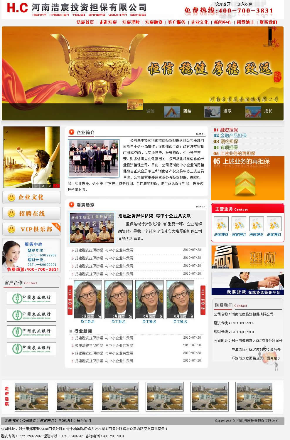 河南浩宸投資擔(dān)保有限公司是經(jīng)河南省中小企業(yè)局批準(zhǔn),在鄭州市工商行政管理局審批注冊成立的,以實(shí)業(yè)投資、投資擔(dān)保、企業(yè)資產(chǎn)管理、財(cái)務(wù)咨詢?yōu)闃I(yè)務(wù)范圍的,按市場化機(jī)制運(yùn)作的專業(yè)投資擔(dān)保公司。目前,公司是河南中小企業(yè)信用擔(dān)保協(xié)會(huì)正式會(huì)員單位和河南省產(chǎn)權(quán)交易中心正式會(huì)員單位。公司目前主要經(jīng)營業(yè)務(wù)有投資擔(dān)保、融資擔(dān)保、實(shí)業(yè)投資、企業(yè)資 產(chǎn)管理、財(cái)務(wù)咨詢、合同履約擔(dān)保、財(cái)產(chǎn)訴訟保全擔(dān)保、投資管理咨詢服務(wù)。網(wǎng)站地址:http://www.hc4007003831.com