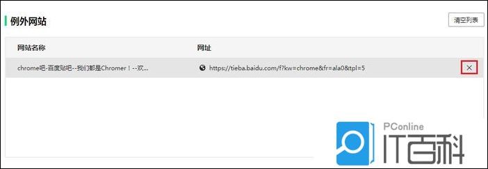 3、進(jìn)入登錄管家設(shè)置頁面后,在頁面中找到“例外網(wǎng)站”這一欄,在其中找到永不保存的網(wǎng)頁,將鼠標(biāo)移動上去之后點擊其右側(cè)的按鈕將其刪除就可以了。